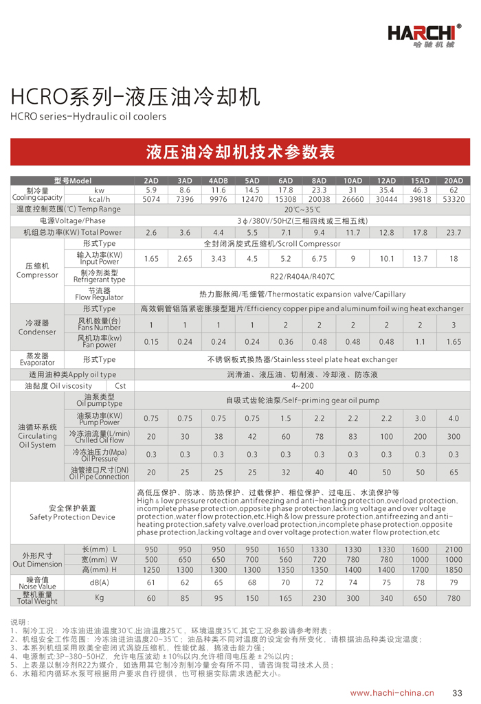 1、制冷能力是在環(huán)境溫度35℃,進(jìn)油溫度35℃,出油溫度30℃,油品為ISO VG32條件下測(cè)得。 2、用戶在選擇油冷機(jī)時(shí),必須選擇油液需控制的溫度范圍(1)18℃-25℃ (2)25℃-35℃ (3)35℃-45℃